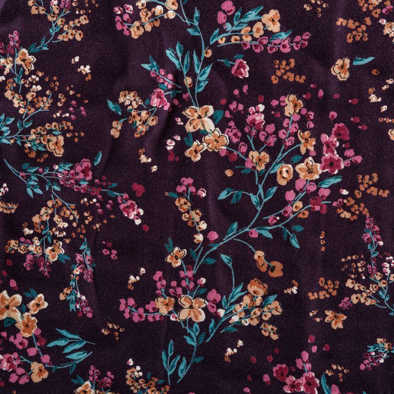 Плотная и мягкая ткань фиолетового оттенка с ярким мелкоцветом, имеет саржевое плетение и характерный диагональный рубчик на поверхности. Отлично сохраняет форму, не сильно мнется и не деформируется в процессе эксплуатации.  Красиво ложится в складки, поэтому прекрасно подойдет на длинные драпированные юбки и платья, на свободные брюки или шорты, топы.