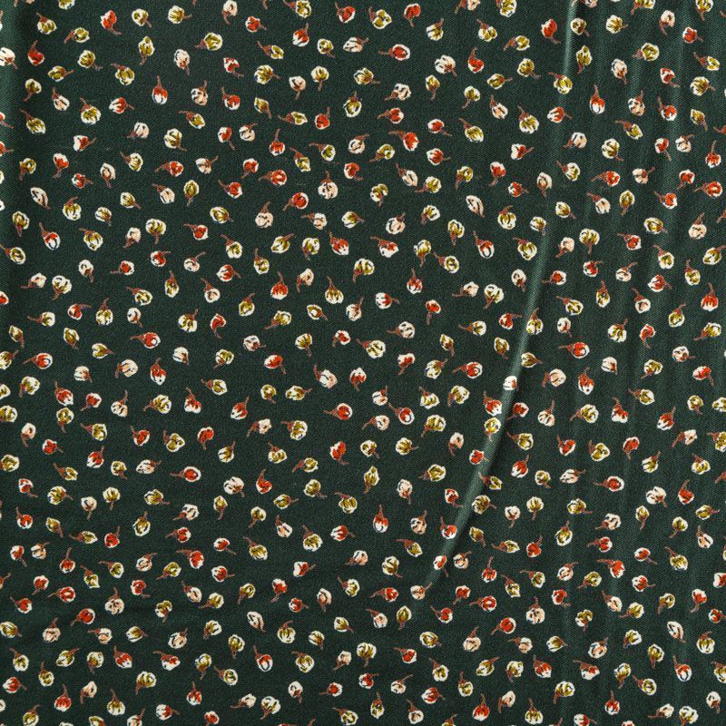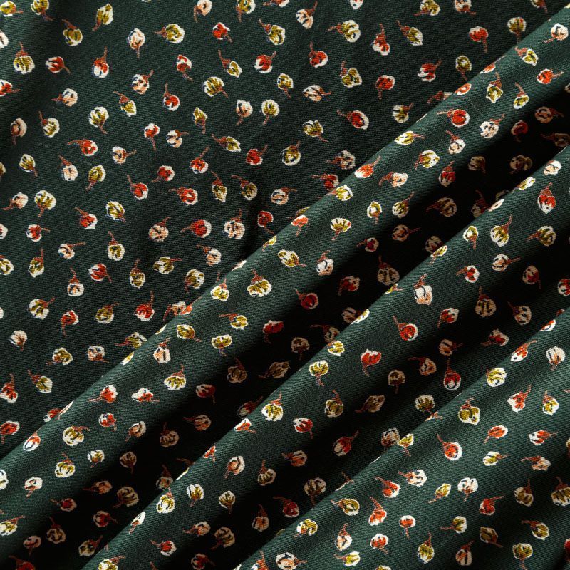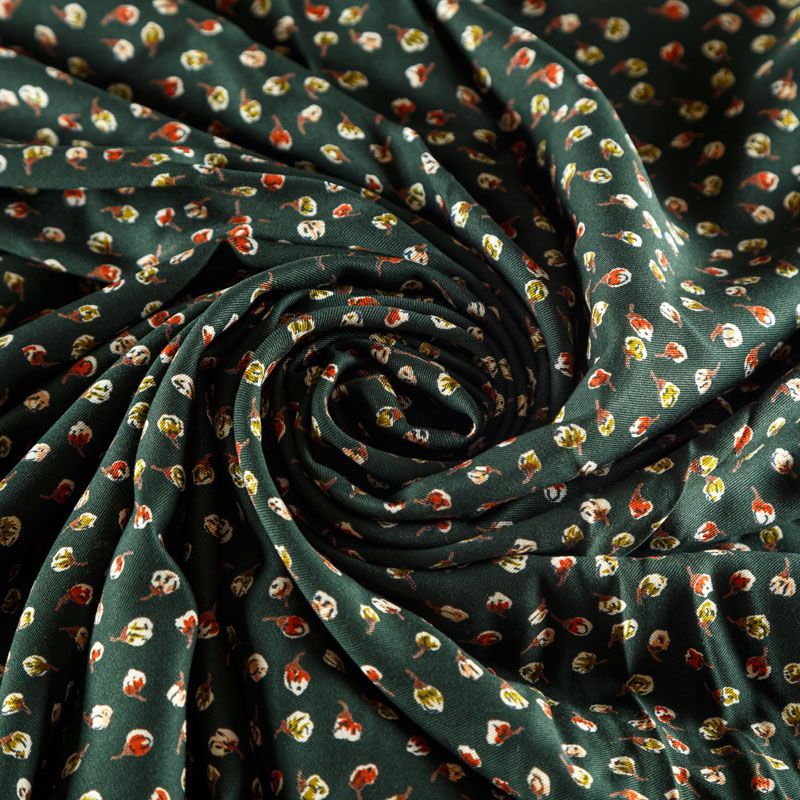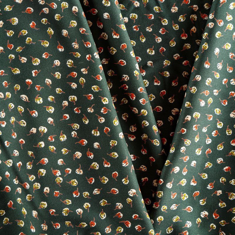 Плотная и мягкая ткань темно-зеленого оттенка с ярким мелкоцветом, имеет саржевое плетение и характерный диагональный рубчик на поверхности. Отлично сохраняет форму, не сильно мнется и не деформируется в процессе эксплуатации. Красиво ложится в складки, поэтому прекрасно подойдет на длинные драпированные юбки и платья, на свободные брюки или шорты, топы, комбинезоны, а также для домашней одежды.