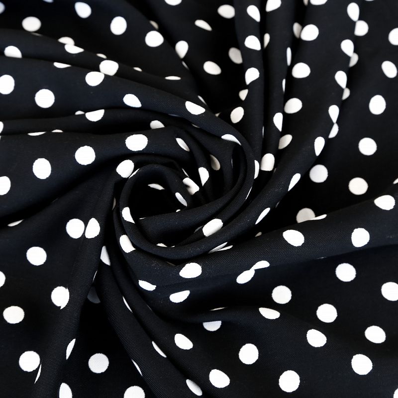 Плотная и мягкая ткань, имеет саржеве плетение и характерный диагональный рубчик на поверхности. Отлично сохраняет форму, не сильно мнется и не деформируется в процессе эксплуатации.  Красиво ложиться в складки, поэтому прекрасно подойдет на длинные драпированные юбки и платья, на свободные брюки или шорты, топы. Размер гороха 1см