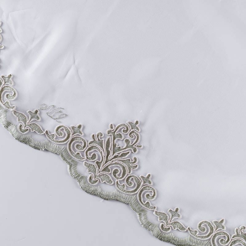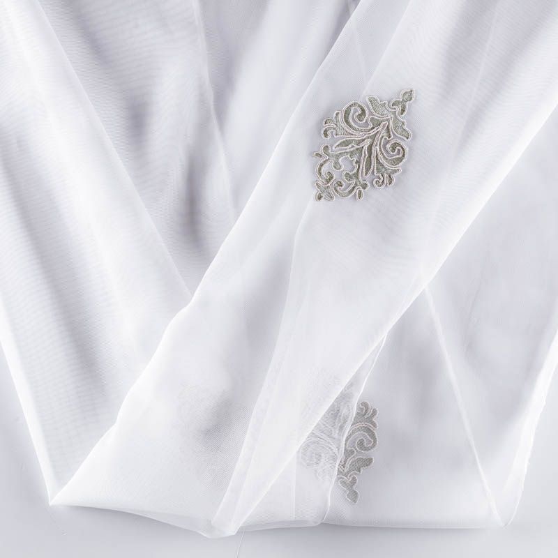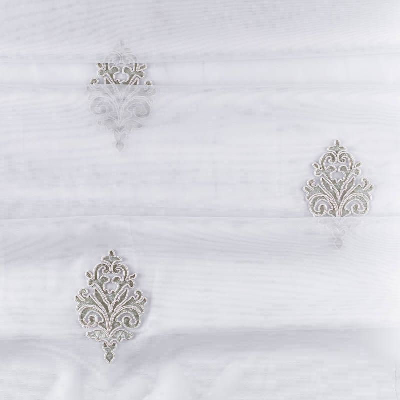 Сетка с вышивкой – это роскошный элемент дизайна, который преобразит любое помещение. Она отлично пропускает воздух, поэтому быстро сохнет после стирки. Прочная, ткань прослужит долго. Выдерживает большое количество стирок. Легкая, фактура ткани практически невесома, поэтому можно не опасаясь крепить ее даже на самый тонкий карниз. Сутажная элегантная вышивка приятного зеленого оттенка в виде "дамасков" расположена по всей высоте ткани, нижний край украшен вышитым фестоном, без утяжелителя, фигурный.