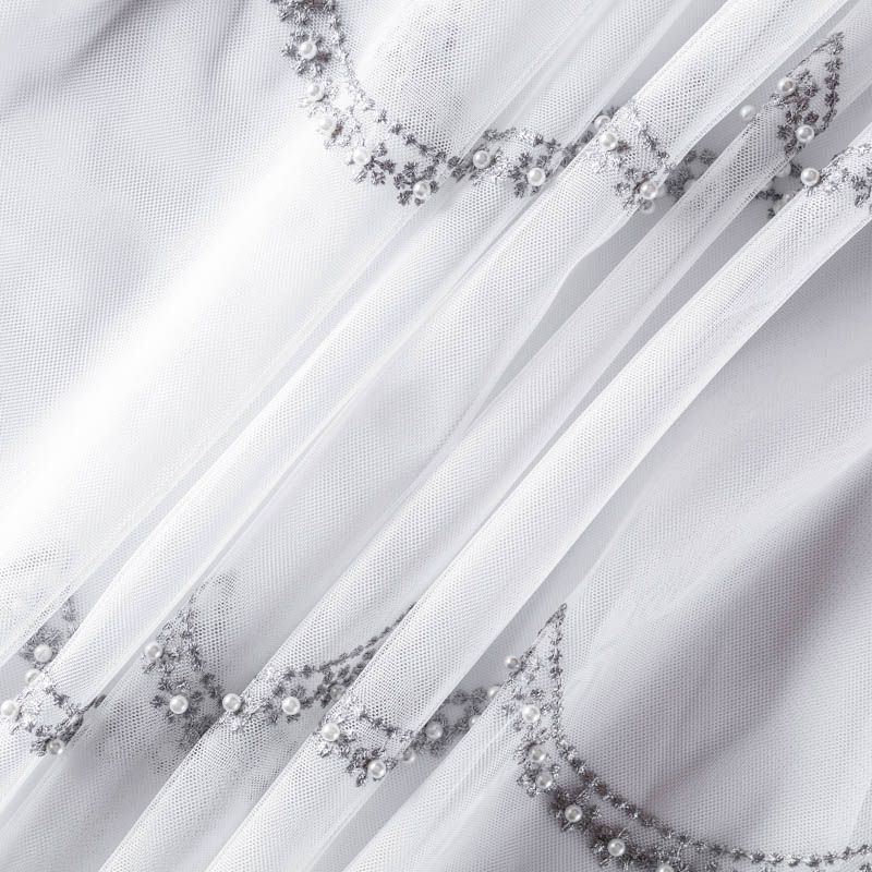 Сетка с вышивкой – это роскошный элемент дизайна, который преобразит любое помещение. Она отлично пропускает воздух, поэтому быстро сохнет после стирки. Прочная, ткань прослужит долго. Выдерживает большое количество стирок. Легкая, фактура ткани практически невесома, поэтому можно не опасаясь крепить ее даже на самый тонкий карниз. Нежная цветочная вышивка с круглыми бусинами серебристо-серого оттенка расположена ярусами, нижний край украшен вышитым фестоном, без утяжелителя, фигурный.