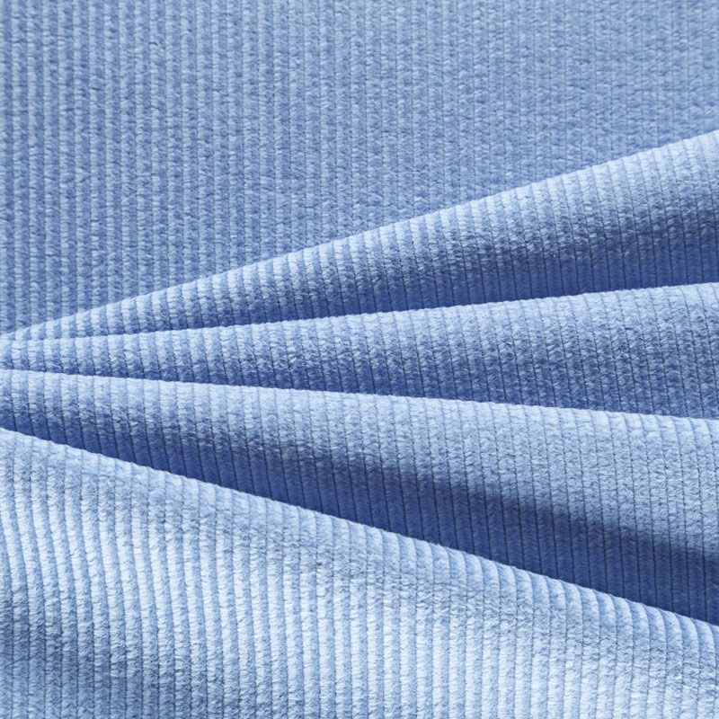 Итальянский хлопковый вельвет костюмно-плательной плотности голубого оттенка. Ткань имеет матовую фактурную поверхность в рубчик средней ширины, ворс короткий, мягкий и приятный на ощупь. Тянется за счет эластана в составе, хорошо драпируется и держит форму. Прекрасный вариант для пошива костюма, юбки, широких брюк, шорт, комбинезона, жакета, куртки или тренча.