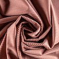 Ткань средней плотности, но удивительно нежная с матовым блеском и мягкой бархатистой поверхностью. За счет вытравки ворса лицевая сторона фактурная, в полоску. Вельвет эластичный, хорошо и мягко драпируется, не мнется. Прекрасно подходит для пошива свитшотов, платьев, юбок, спортивных костюмов, а также  для изготовления даже детской одежды.