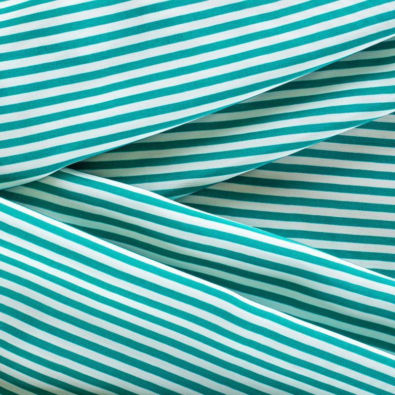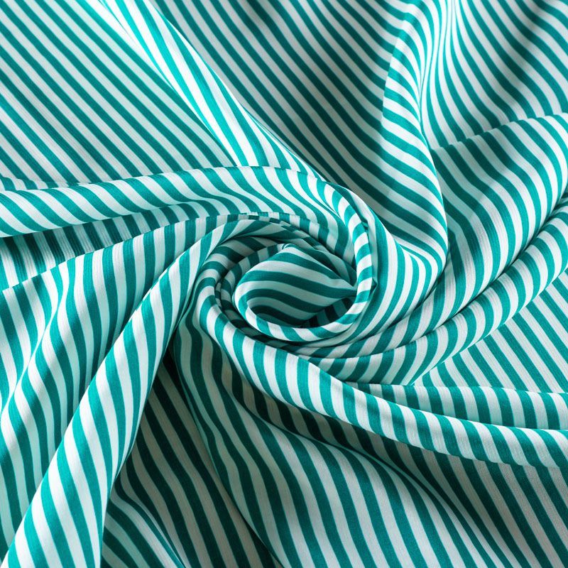 Плательно-рубашечная итальянская вискоза с принтом в горизонтальную полоску зеленого оттенка. Натуральная, дышащая ткань, очень приятная к телу, отлично драпируется, струится, не просвечивает. Хорошо подойдет для пошива платьев, рубашек, платьев-рубашек, блуз, юбок, брюк, летних костюмов, пыльников, детской одежды.