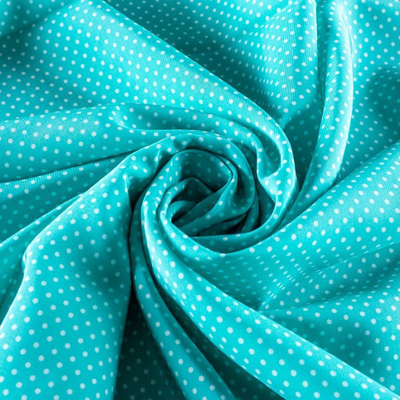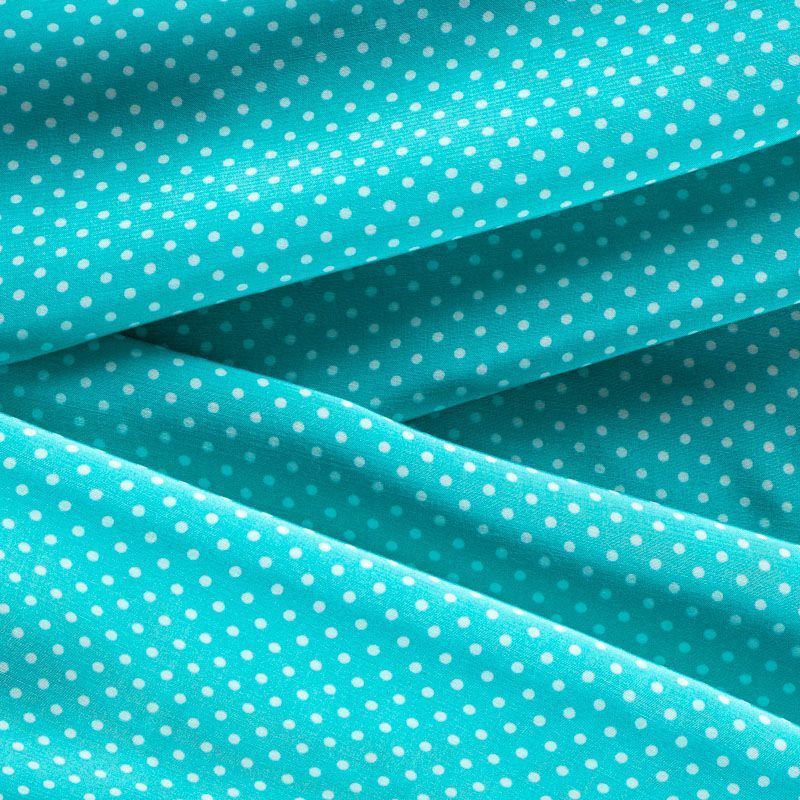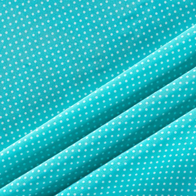 Плательно-рубашечная итальянская вискоза бирюзового оттенка с принтом в мелкий горошек. Натуральная, дышащая ткань, очень приятная к телу, отлично драпируется, струится, не просвечивает. Хорошо подойдет для пошива платьев, рубашек, платьев-рубашек, блуз, юбок, брюк, летних костюмов, пыльников, детской одежды.