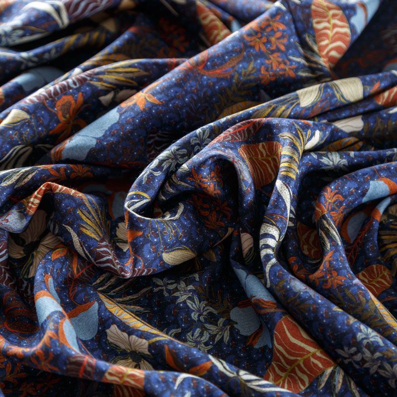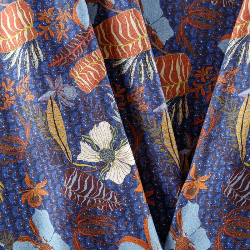 Итальянская плательно-блузочная вискоза со стилизованным цветочным принтом на темно-синем фоне. Ткань очень пластичная, отлично драпируется и струится, мягкая и приятная на ощупь, не просвечивает. Прекрасно подойдет для пошива платья, рубашки, топа, блузки, юбки, летнего костюма.