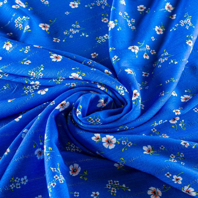 Итальянская плательно-блузочная вискоза с мелким цветочным принтом на васильковом фоне декорирована тонкой люрексовой полоской. Ткань очень пластичная, отлично драпируется и струится, мягкая и приятная на ощупь, не просвечивает. Прекрасно подойдет для пошива платья, топа, блузки, юбки.
