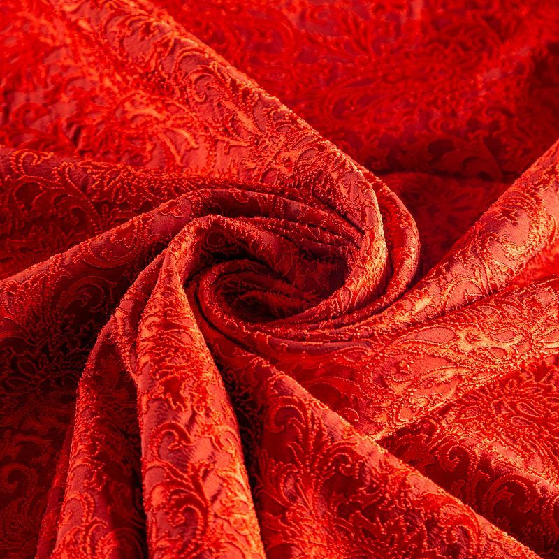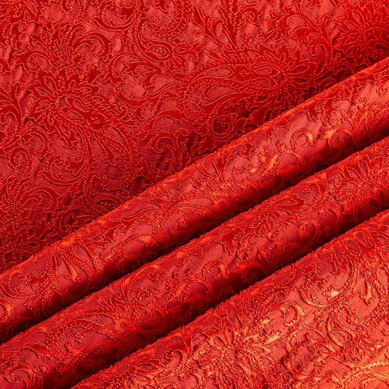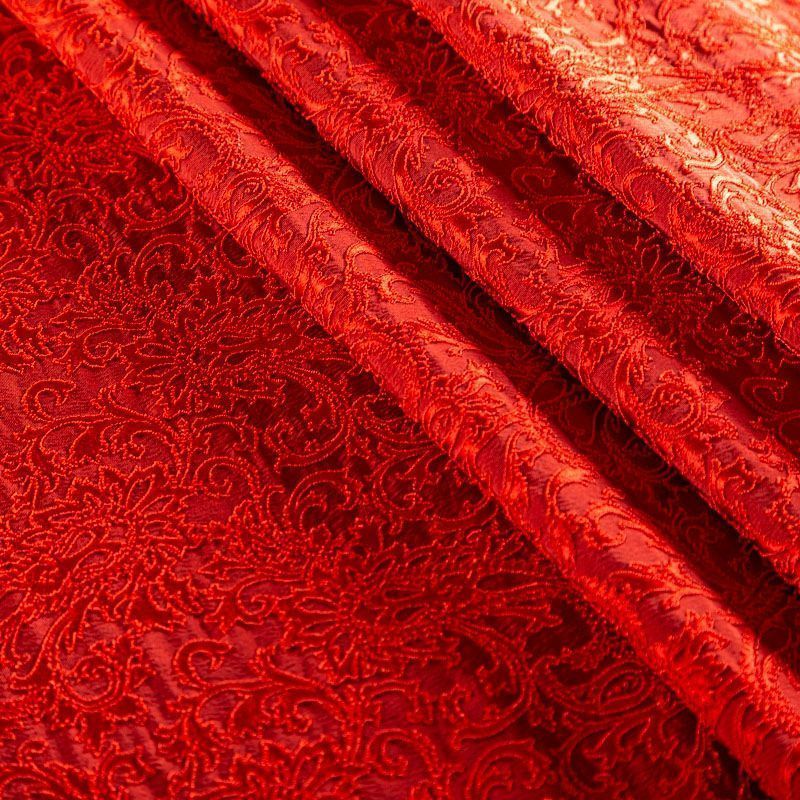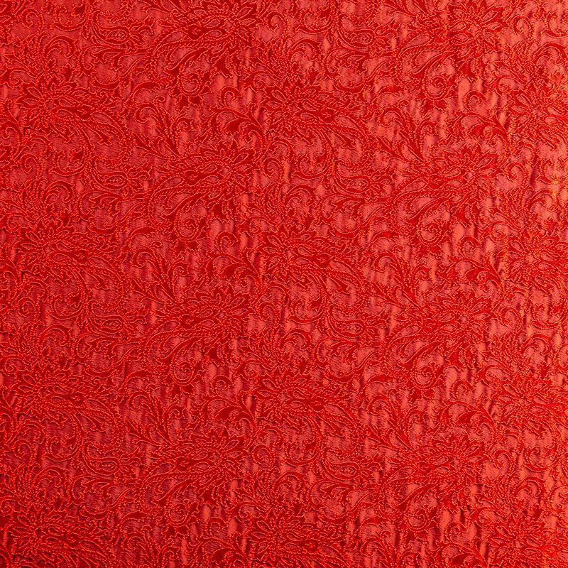 Итальянский жаккард с красивым сложным орнаментом насыщенного красного оттенка. Ткань легкая, но плотная, поверхность со сдержанным блеском объемная и текстурная, хорошо драпируется и держит форму, тянется за счет эластана в составе, не просвечивает. Подойдет для пошива нарядных вечерних костюмов, платьев-футляров в стиле Dior, жакетов, топов, легких пальто, бомберов, юбок или шорт.