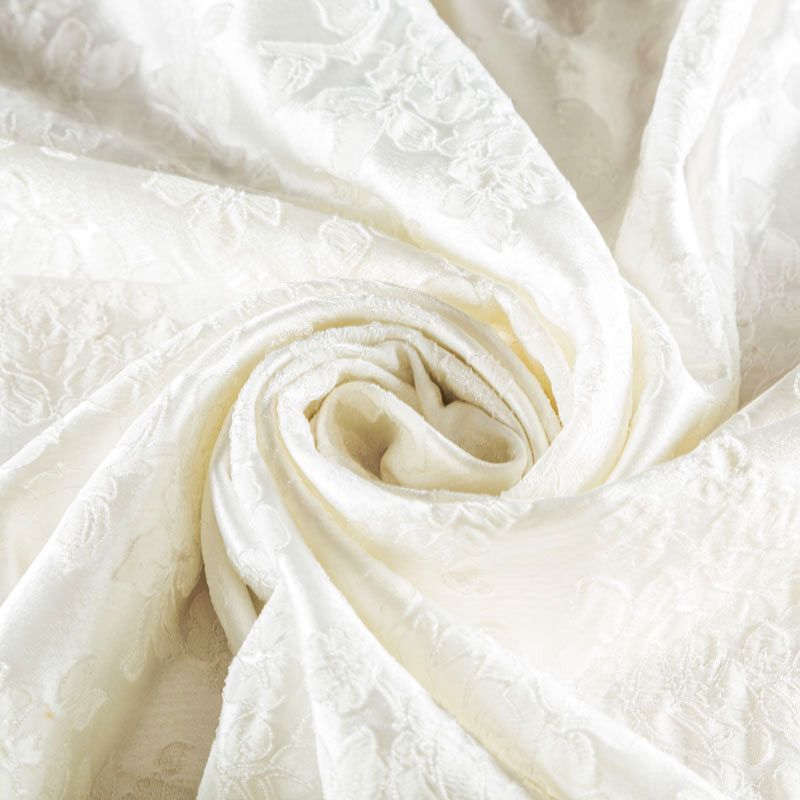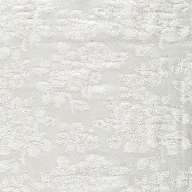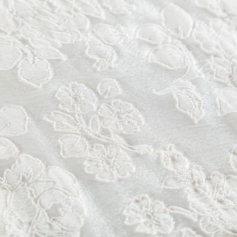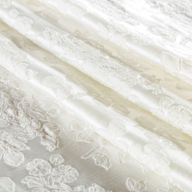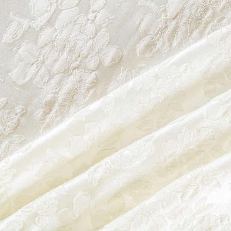 Итальянский жаккард с красивым цветочным орнаментом молочного оттенка. Ткань легкая, но плотная, поверхность со сдержанным блеском, объемная и текстурная, хорошо драпируется и держит форму, тянется за счет эластана в составе, не просвечивает. Подойдет для пошива нарядных вечерних костюмов, корсетов, платьев-футляров, жакетов, топов, легких пальто, бомберов, юбок или шорт.