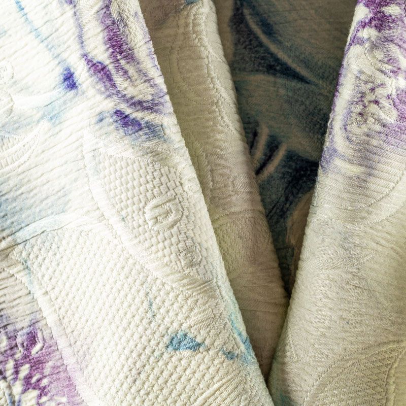 Итальянский жаккард с абстрактным акварельным принтом и цветочным дизайном. Ткань плотная, поверхность со сдержанным блеском, объемная и текстурная, хорошо драпируется и держит форму, не тянется, не просвечивает. Подойдет для пошива нарядных вечерних костюмов, платьев-футляров в стиле Dior, жакетов, топов, летних пальто, бомберов, юбок или шорт.