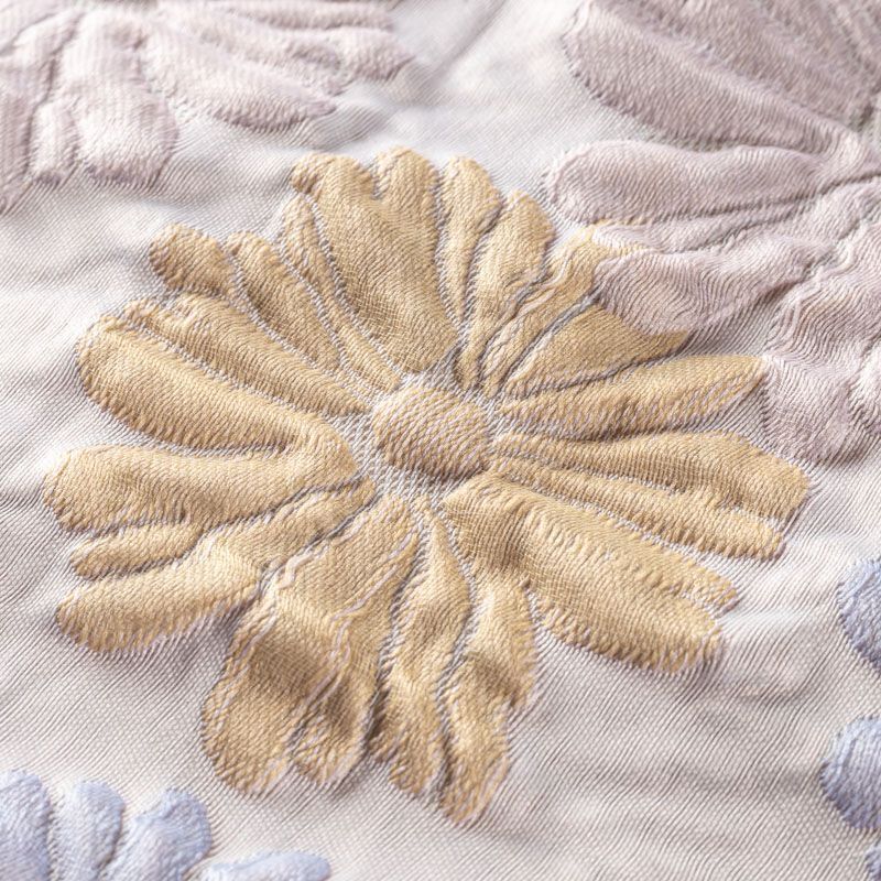 Итальянский жаккард с нежным и романтичным дизайном из фактурных ромашек голубого, светло-желтого и розового оттенков. Ткань легкая, но плотная, поверхность матовая, объемная и текстурная, хорошо драпируется и держит форму, не тянется, не просвечивает. Подойдет для пошива нарядных вечерних костюмов, платьев-футляров в стиле Dior, жакетов, топов, летних пальто, бомберов, юбок или шорт.