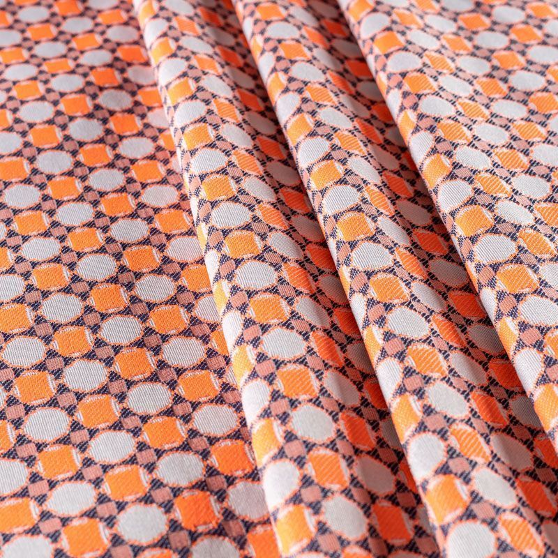 Мягкий жаккард с ярким геометрическим узором. Ткань пластичная, непрозрачная, поверхность фактурная, приятная на ощупь, тянется за счет эластана в составе, немного жержит форму, хорошо драпируется. Будет комфортна для пошива костюма, женственного платья, юбки, брюк, шорт, легкого пальто или мягкого бомбера.