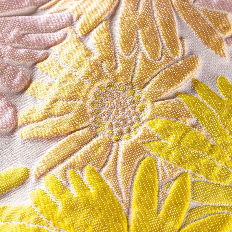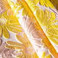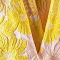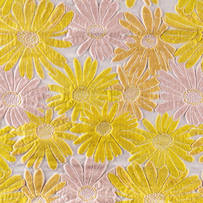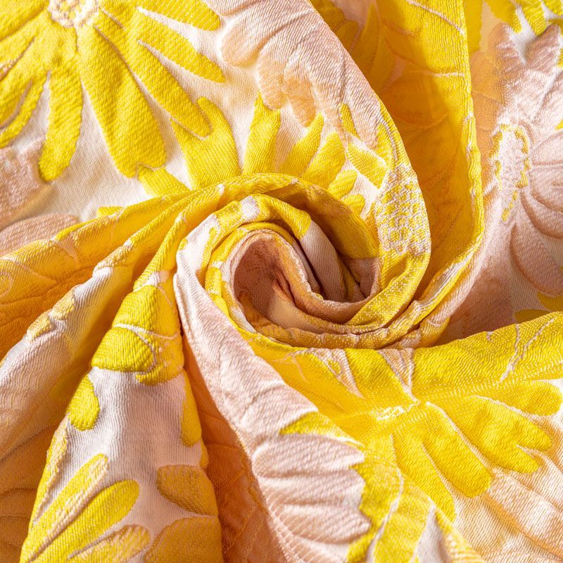 Итальянский жаккард с романтичным дизайном из фактурных ромашек в желтых и пудровых оттенках. Ткань легкая, но плотная, поверхность со сдержанным блеском, объемная и текстурная, хорошо драпируется и держит форму, не тянется, не просвечивает. Подойдет для пошива нарядных вечерних костюмов, платьев-футляров в стиле Dior, жакетов, топов, летних пальто, бомберов, юбок или шорт.