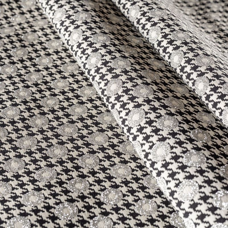 Итальянский хлопковый жаккард с классическим узором пье-де-пуль (гусиная лапка) украшен небольшими кружочками с серебристым люрексом. Ткань средней плотности, поверхность матовая, фактурная, хорошо драпируется и держит форму, тянется за счет эластана в составе, не просвечивает. Подойдет для пошива нарядных вечерних костюмов, платьев-футляров в стиле Dior, жакетов, топов, летних пальто, бомберов, юбок или шорт.