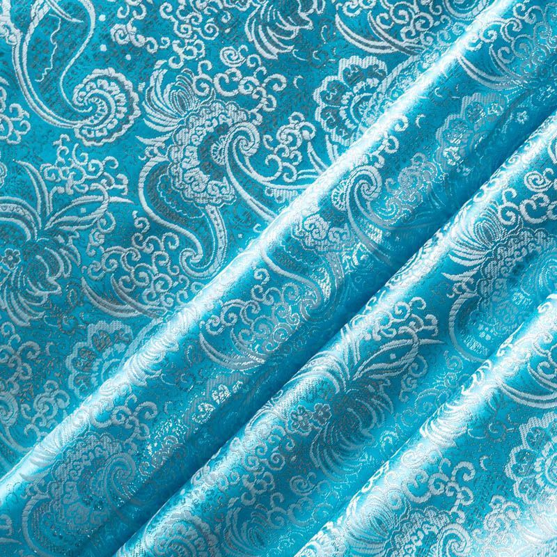 Насыщенная ткань плотного переплетения с декоративной поверхностью, покрытая сложным орнаментом из блестящих нитей. Ткань легкая, отлично драпируется, держит форму, отличается прочностью, долговечностью, износостойкостью и простотой в уходе, не смотря на свою высокую декоративность. Нарядность ткани придает золотая люрексовая нить. Подходит для пошива юбок, платьев, топов, сценических костюмов.